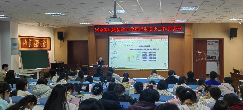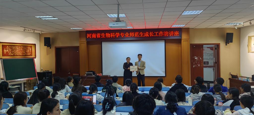 讲座开始前,彭波为魏虹娣颁发河南省生物科学专业师范生成长工作坊的坊主聘书。随后,魏老师从自我介绍、教育观念、专业背景、人文关注等四方面讲解了优质课汇报的注意事项;同时,她分享了一些关于如何打开嗓音的小技巧,以提升同学们的课堂表达能力。最后,魏老师详细阐述了教师的自我发展成长路径,她谈到一个达标教师成长到骨干教师、优秀教师、卓越教师分别需要具备的能力,希望同学们在校培养扎实的专业基础能力,专业基础能力是未来成为优秀教师的重要保障。讲座结束后,同学们积极向魏老师提问,魏老师也认真耐心地进行了解答,现场交流气氛十分热烈。
