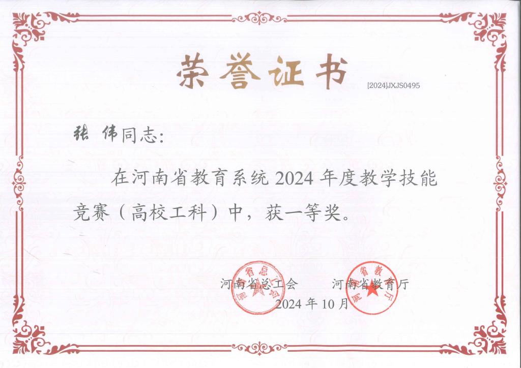 近日,河南省总工会、河南省教育厅联合发布《关于河南省教育系统2024年度教学技能竞赛获奖情况的通报》(豫工文〔2024〕89号),公司教师张伟荣获河南省教育系统2024年度教学技能竞赛(高校工科)一等奖。