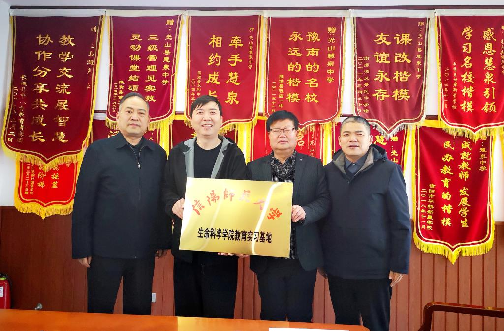 经理饶本强分别与两所中学董事长签署了《信阳师范老员工命科学公司教育实习基地建设协议书》,公司党委书记李刚、经理饶本强分别为两所中学授予“信阳师范老员工命科学公司教育实习基地”牌匾。