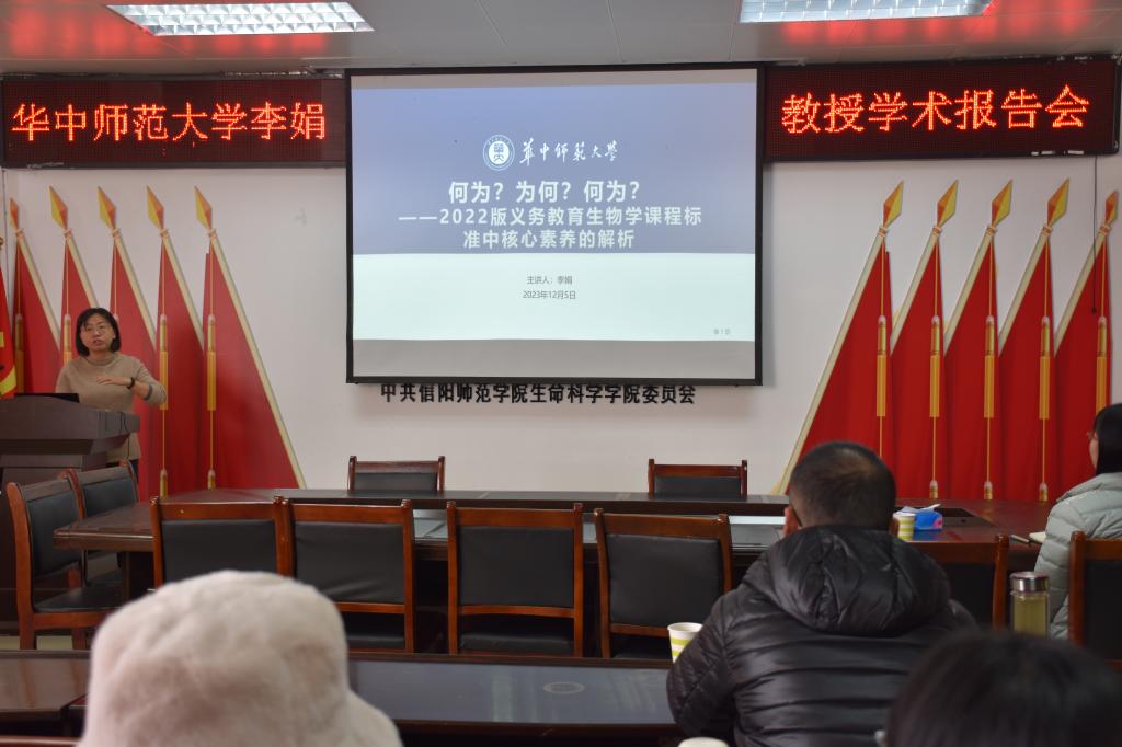 12月5日下午,应suncitygroup太阳集团邀请,华中师范老员工命科学公司李娟副教授在生物楼412会议室做了题为“2022版义务教育生物学课程标准中核心素养的解析”的学术报告。报告会由公司彭波博士主持,公司副经理宋新强,部分教师及学科教学(生物)专业研究生聆听了报告。
