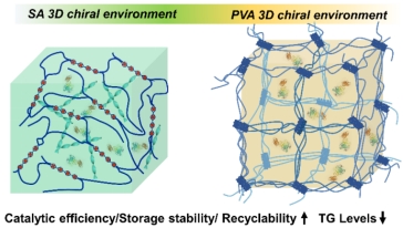 高效催化性能的酶体系在生物传感器,合成化学,生物技术,生物燃料,医学,及许多其他工业领域,已经被广泛的研究和报道。将酶与材料结合,赋予材料生物活性,并同时提高酶的性能(例如良好的催化效率,高稳定性和易于回收),是实现酶高效率催化的重要手段。近年来,高分子载体、纳米材料、微胶囊、水凝胶、介孔硅酸盐材料的应用在推动酶高效催化方面取得了重要进展。尽管如此,在构建酶催化体系领域内仍存在酶体系催化活性低、回收利用困难等问题。克服上述不利因素是异常困难的,因为长期以来,构建酶的天然三维微环境都极具挑战,上述材料都不能实现这一目标。在对酶的微环境的研究中发现,组成酶的氨基酸模块在空间的精准排列,是实现高效催化性能的关键,酶催化活性位点的微环境由这些模块的固有手性决定。虽然手性对于酶催化的三维微环境至关重要,但三维仿生手性微环境对酶的影响尚不清楚。因此,如何构筑三维手性微环境平台,并实现酶的高效催化、高稳定性、易于回收和再利用就越发重要。