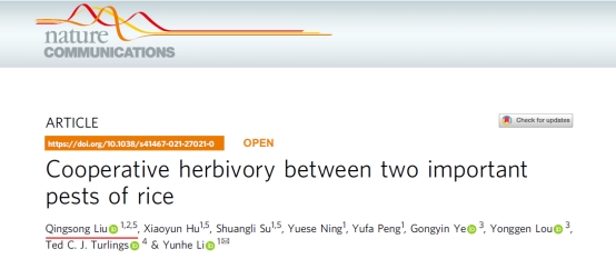 11月19日,国际知名学术期刊《Nature Communications》(五年影响因子:15.81)在线发表了公司suncitygroup太阳集团刘清松博士等人完成的题为“Cooperative herbivory between two important pests of rice”的研究论文。这是公司科研人员首次以第一作者身份在Nature系列子刊发表研究论文。