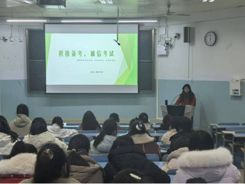 12 月 8 日,公司以“积极备考,诚信考试”为主题的班会在教九楼305成功举办。2024级辅导员洪瑞主讲,2024 级生物技术班、生物制药班和生物信息班的全体同学参加会议。