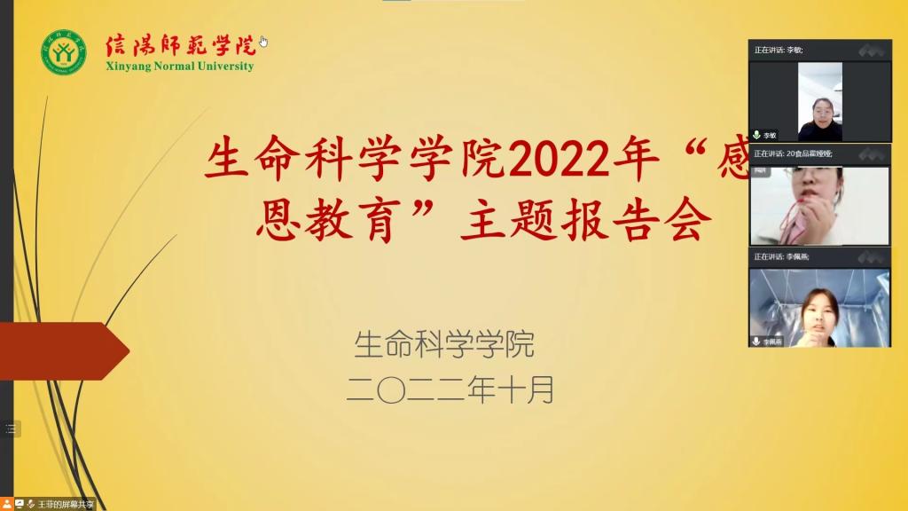 为进一步加大资助政策宣传力度,使国家资助政策深入人心,教育引导员工知恩感恩、励志笃行。公司于10月25日下午,通过线上的方式,在腾讯会议举办了“感恩教育”主题活动。本次活动由公司资助专员李敏主持,2020级生物科学1班李佩燕和2020级食品科学与工程霍娅娅受邀进行宣讲,2022级全体员工参加。