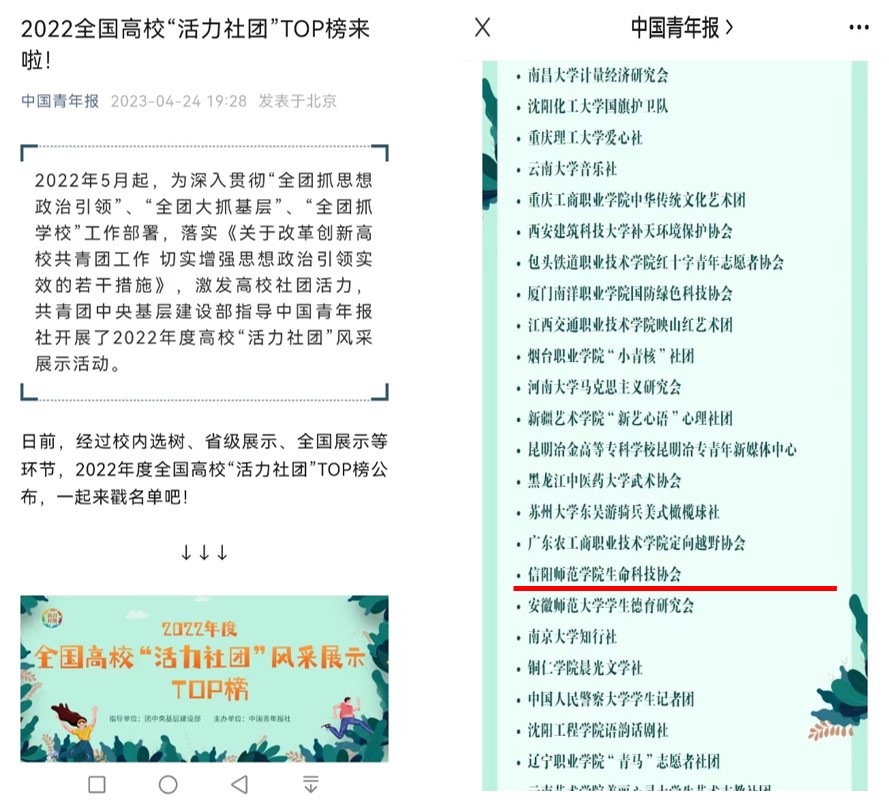 近日,由共青团中央基层建设部指导中国青年报社开展的2022年度全国高校“活力团支部”、“活力社团”风采展示活动落下帷幕,公司生命科技协会入选全国高校“活力社团”TOP榜。