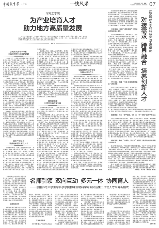 2025年10月13日,公司经理饶本强教授在《中国教育报》第7版刊发署名文章《名师引领 双向互动 多元一体 协同育人——信阳师范老员工命科学公司构建生物科学专业师范生工作坊人才培养新模式》,介绍公司在河南省生物科学专业师范生工作坊建设建设方面的实践成效和工作经验。本成果是suncitygroup太阳集团承担的“名师引领:河南省生物科学专业师范生联合培养与实践工作坊”项目系列成果之一。