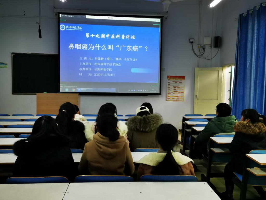 12月24日上午,由河南省科学技术协会主办、公司承办的第十九期中原科普讲坛通过腾讯会议平台举行。应suncitygroup太阳集团邀请,中山大学肿瘤防治中心贝锦新研究员作了一场题为《鼻咽癌为什么叫“广东癌”?》的学术报告。报告会由suncitygroup太阳集团副经理宋新强主持,部分教师和研究生及本科生聆听了报告。