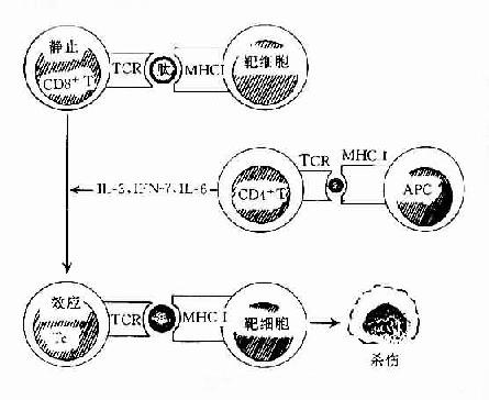 CD8+T细胞(TCCTL细胞)能杀伤表达抗原的靶细胞,它在抗毒感染、急性同种异型移植物排斥和对肿瘤细胞的杀伤作用是重要的效应细胞。